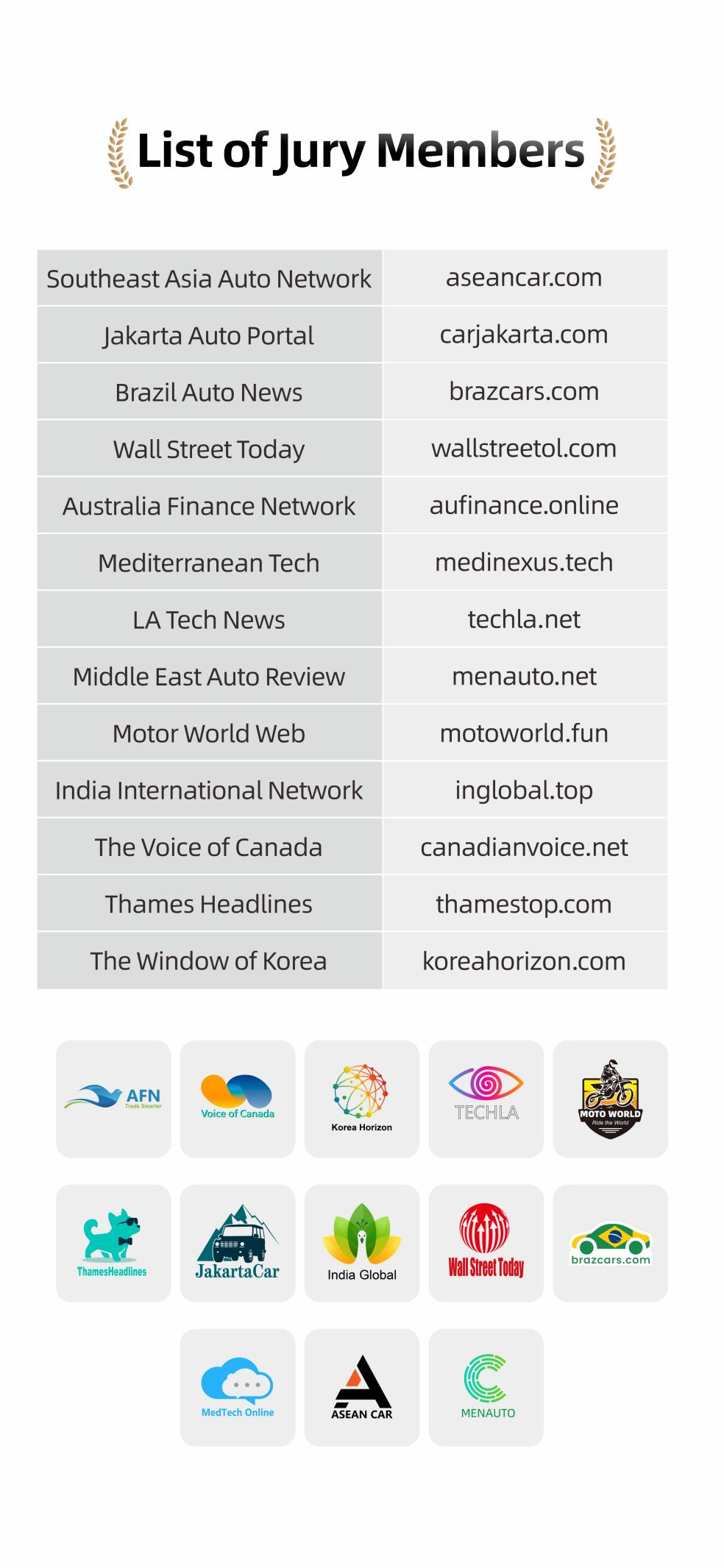 The organizers have assembled a robust and professional judging panel in collaboration with nearly 13 overseas media partners, including Southeast Asia Auto Network, Jakarta Auto Portal, Brazil Auto News, Wall Street Today, Australia Finance Network, Mediterranean Tech, LA Tech News, Middle East Auto Review, Motor World Web, India International Network, The Voice of Canada, Thames Headlines, and The Window of Korea.